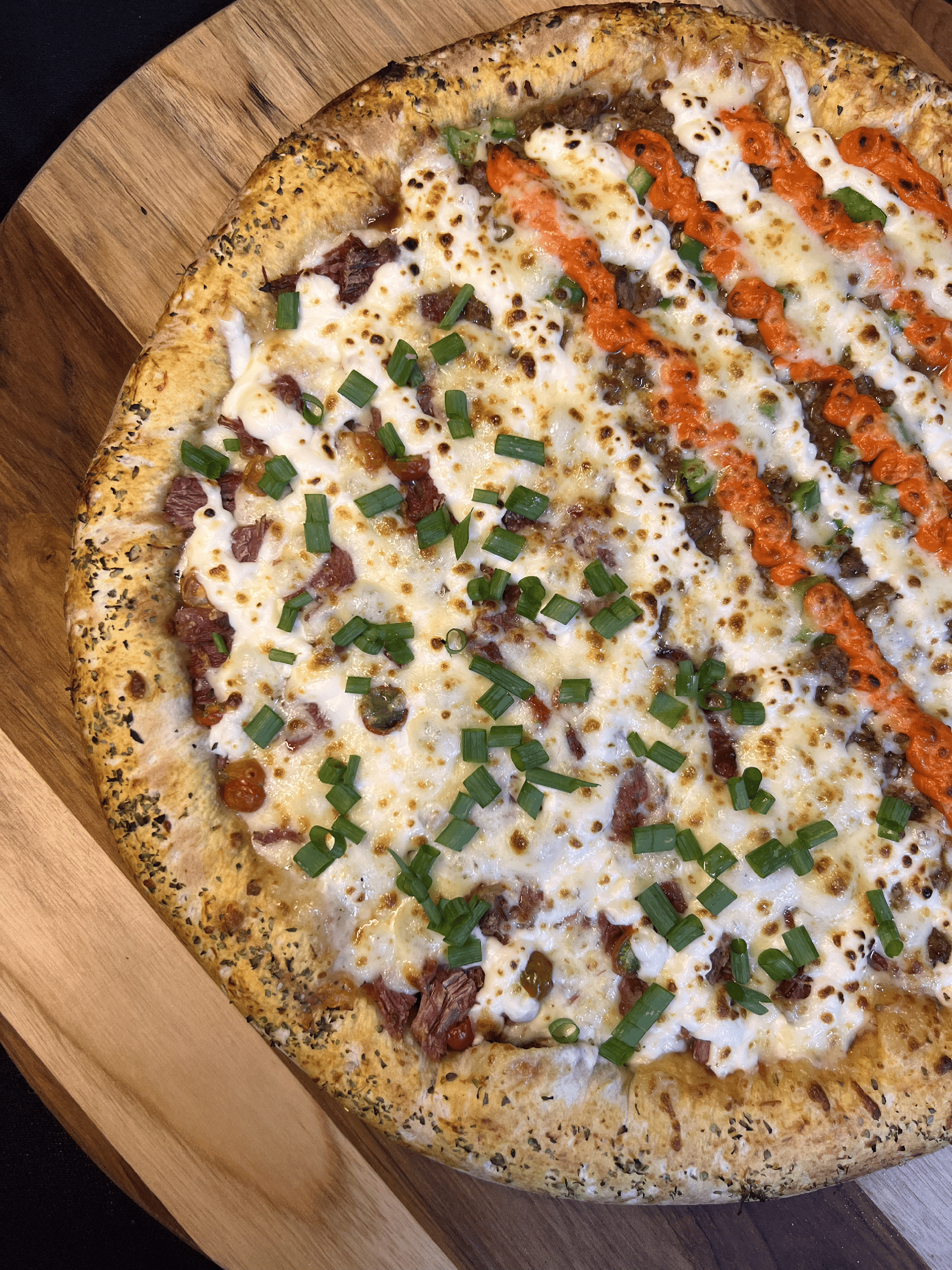 Mussarela, Cream Cheese, Carne Seca, Tomate Cereja, Cebolinha